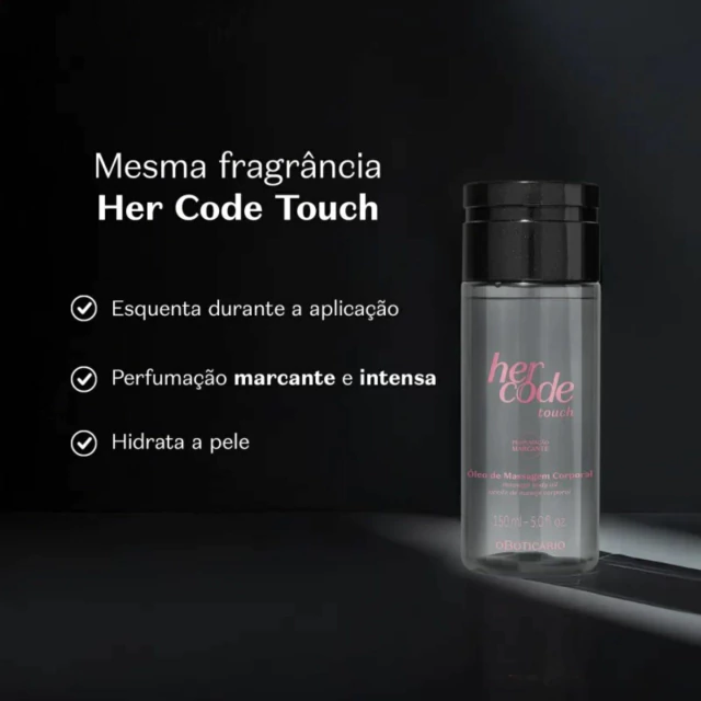 O Óleo de Massagem Corporal Her Code Touch é um convite envolvente para você explorar e descobrir o seu prazer absoluto através do toque. Esquenta durante a aplicação e proporciona à massagem uma sensação prazerosa, deixando a pele intensamente perfumada, hidratada e com a sensação de relaxada. Uma ótima opção de presente para mulher!