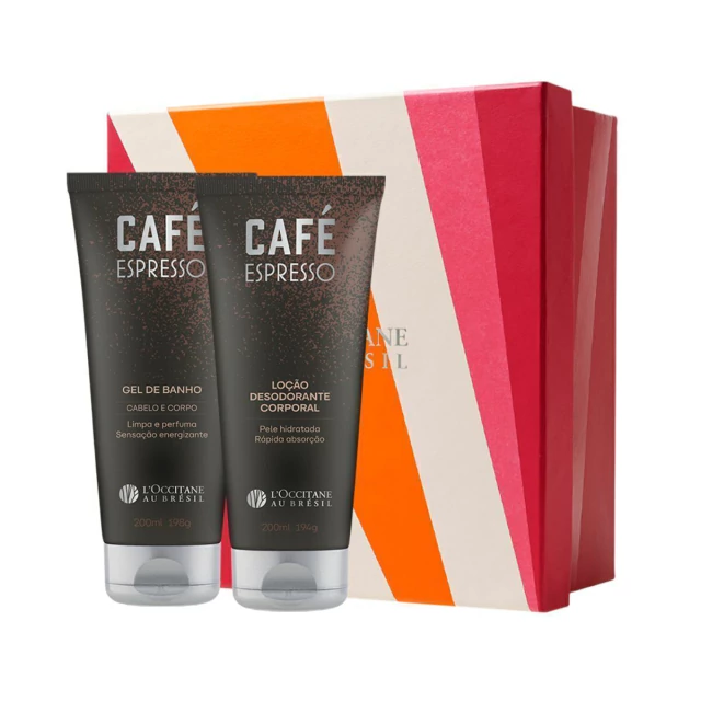 Essa composição contém Gel de Banho Café Espresso 200ml, Loção Desodorante Corporal Café Espresso 200ml e caixa presenteável.